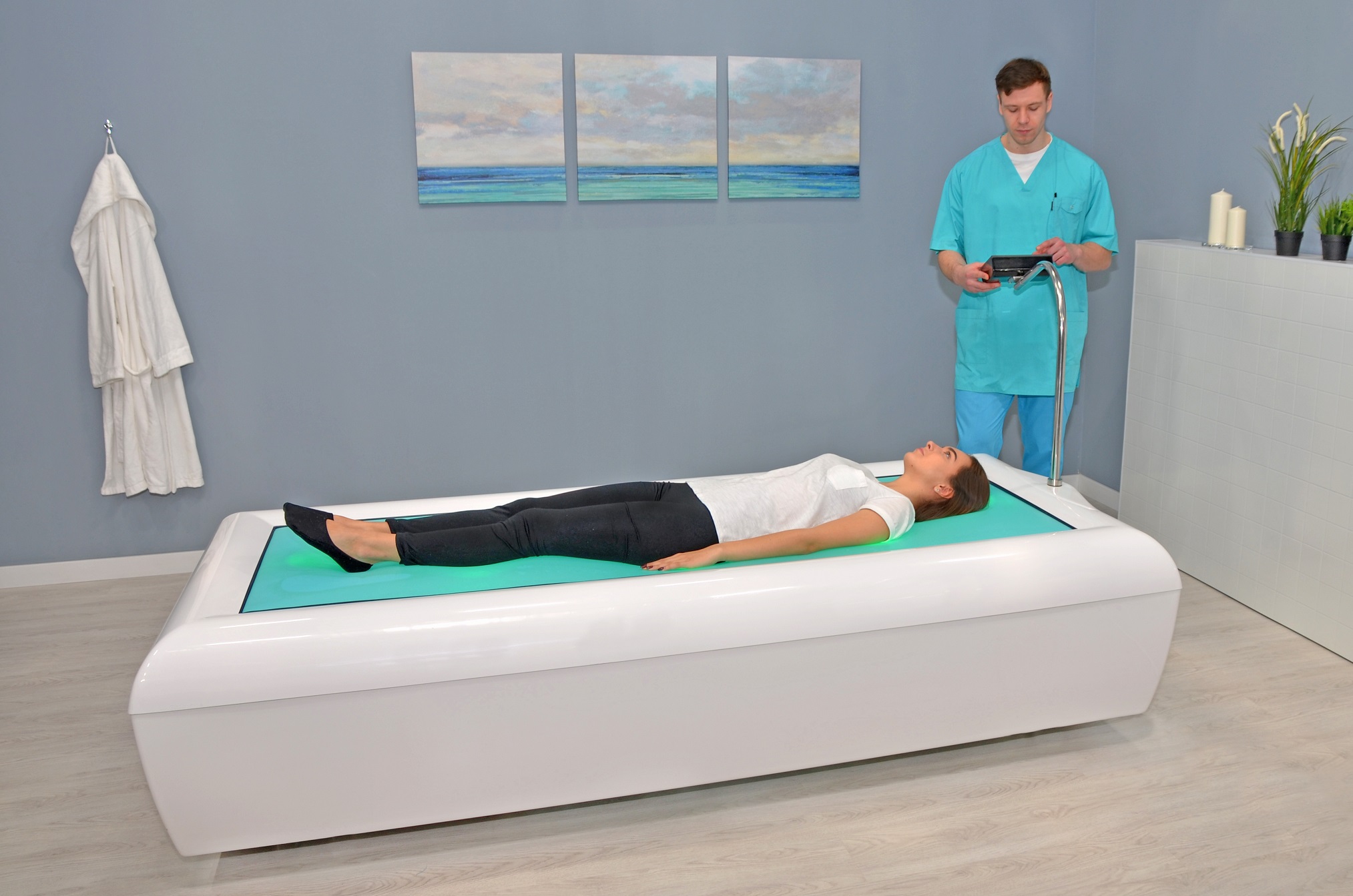 По сути устройство сочетает в себе массаж и водную среду: массаж выполняется в ванне, оборудованной специальными форсунками и вспомогательными приспособлениями для работы с разными зонами тела. За счёт этого процедуры выходят на иной уровень по эффективности и комфорту.