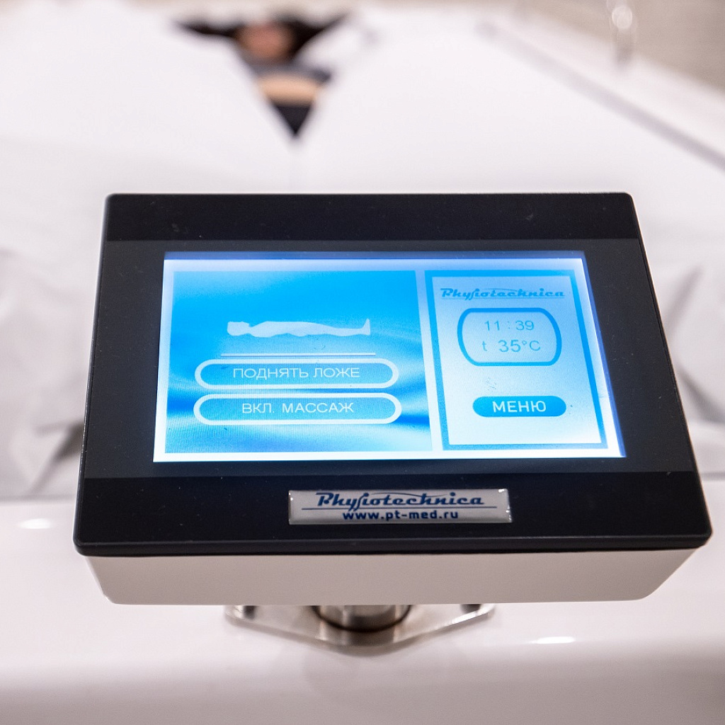 Ванна Посейдон оборудована цветным сенсорным ЖК дисплеем, с помощью которого осуществляется программирование всех режимов и непосредственно управление ходом процедуры медицинским персоналом:
